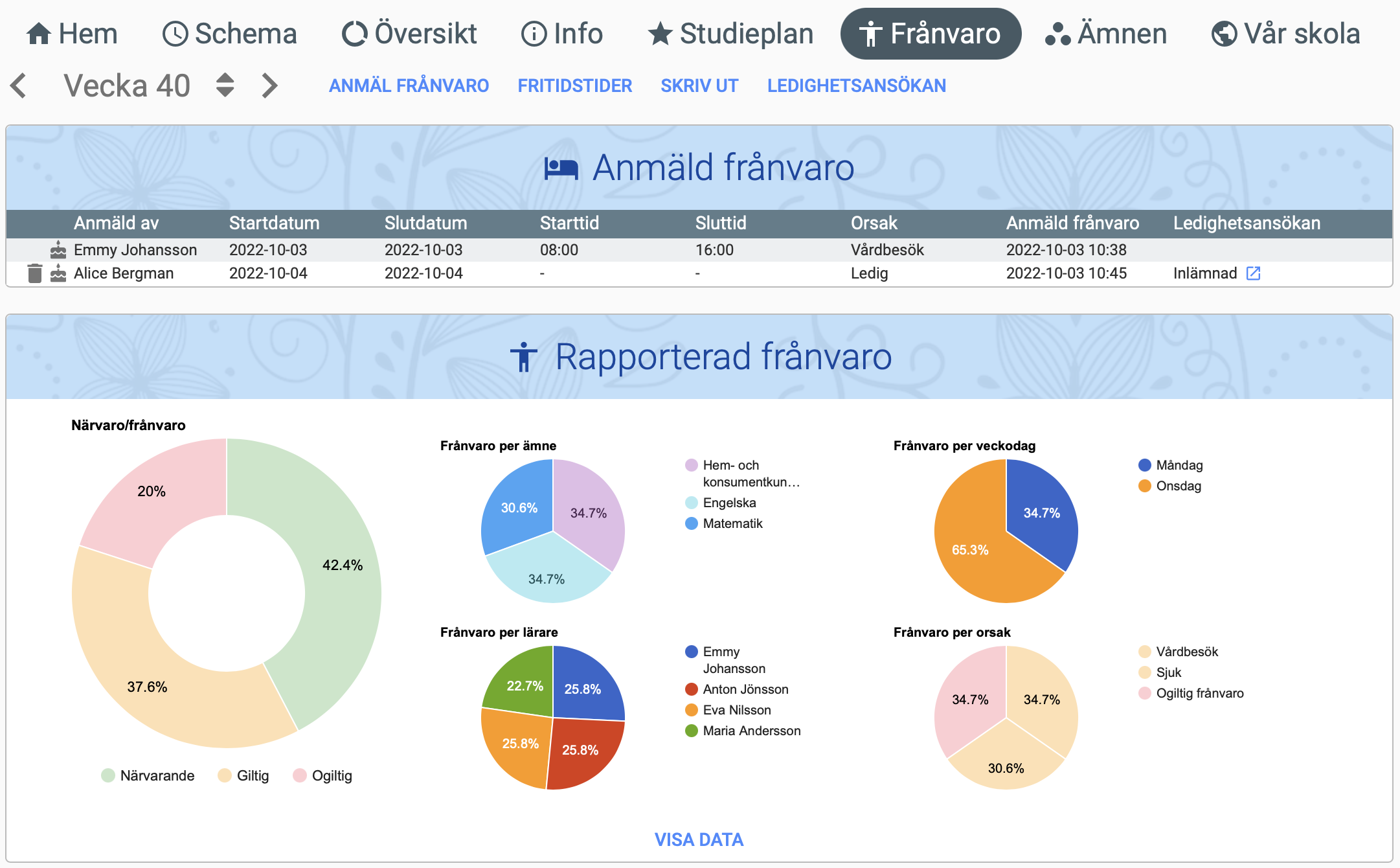 Utöver veckoschemat finns det möjlighet att visa detaljerat statistik över valfri tidsperiod. Exempel: Vilka elever har mest ogiltig frånvaro? Vilket ämne, lärare eller