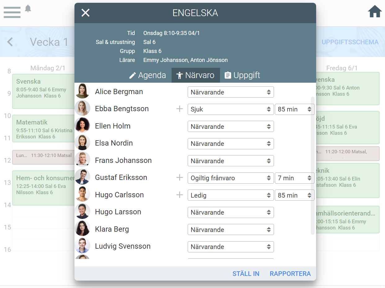 det automatiskt ut en rapport till eleven och dess närstående. I lärarens schema är färgerna de samma men återspeglar i stället om läraren har rapporterat frånvaro för aktuell lektion eller ej.
