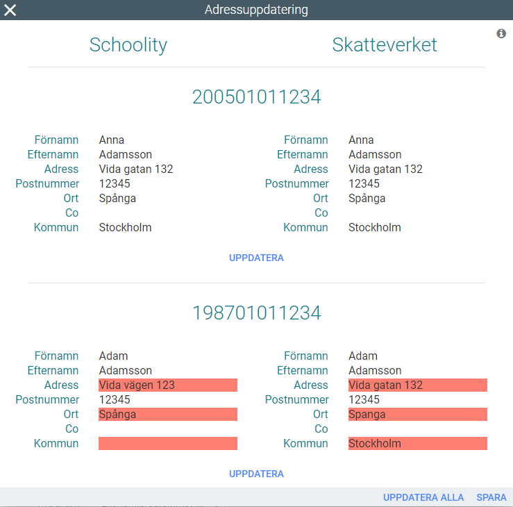 Det här verktyget finns tillgängligt för enskilda elever/studenters och deras vårdnadshavare. "Adressuppdateringen" kan göras för en enskild elev/student (och dens eventuella vårdnadshavare) genom deras individuella infoflik eller för flera elever samtidigt i det Avancerade läget. På de enskilda Info-flikarna finns en knapp som säger "Adressuppdatering".