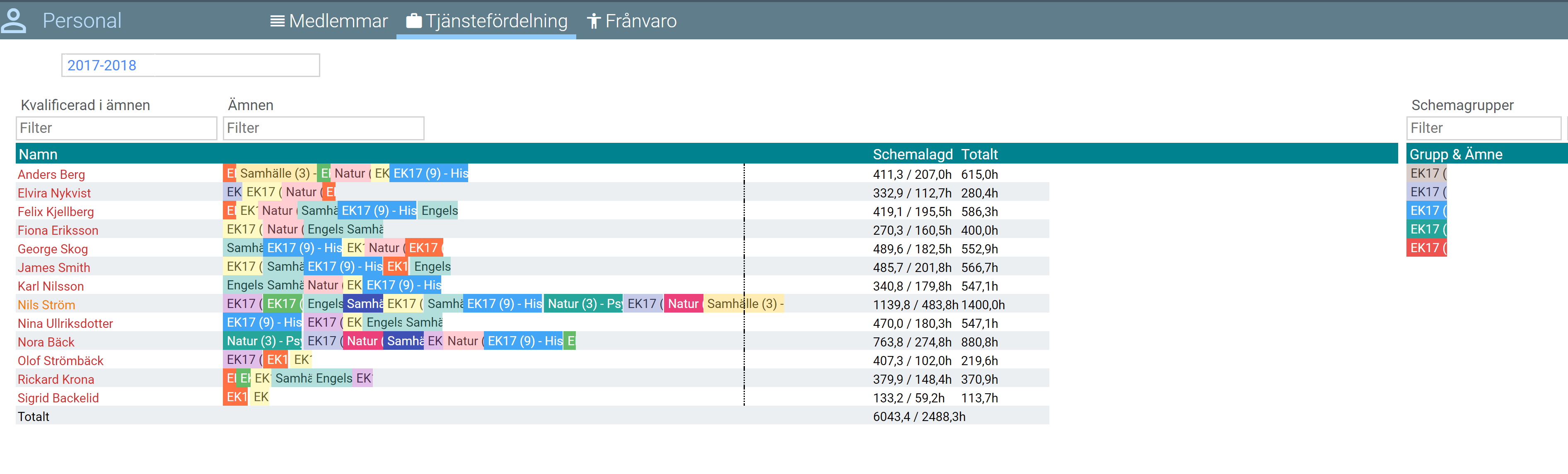 Håll muspekaren över namnet på en personal för att visa informationen om en specifik lärares tjänstegrad direkt i listan över tjänstefördelningen. Då visas information om lärarens arbetsgrad, beläggning och timmar.