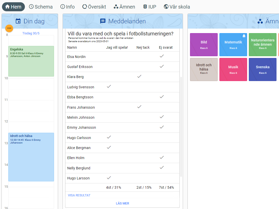 Resultatet kan vara synligt för bara personal eller för alla (elever, vårdnadshavare och personal). Vem som kan se resultatet och vilken typ av resultat som visas beror på vilka