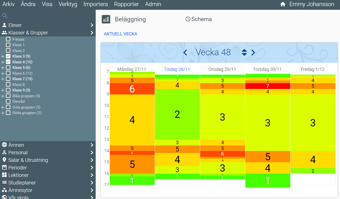 Beläggning fritidstider visar hur många elever som beräknas vara på plats vid olika tider.