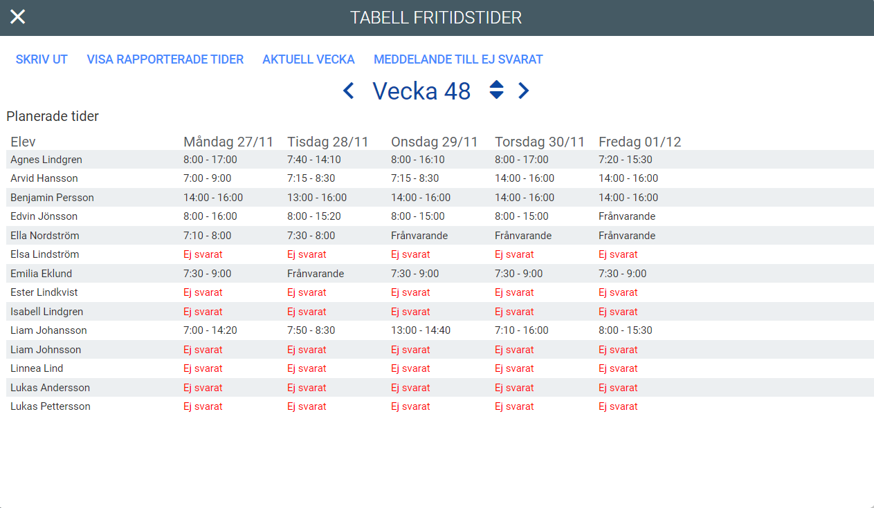 Tabell fritidstider visar närvaron i tabellvy. På bilden nedan visas planderade tider, och om man klickar på knappen "Visa rapporterade tider" visas de faktiska tider som eleverna har checkats in eller ut. Knappen "Meddelande till ej svarat" öppnar funktionen för att skicka ett meddelande till de närstående som ännu inte har registrerat fritidstider.