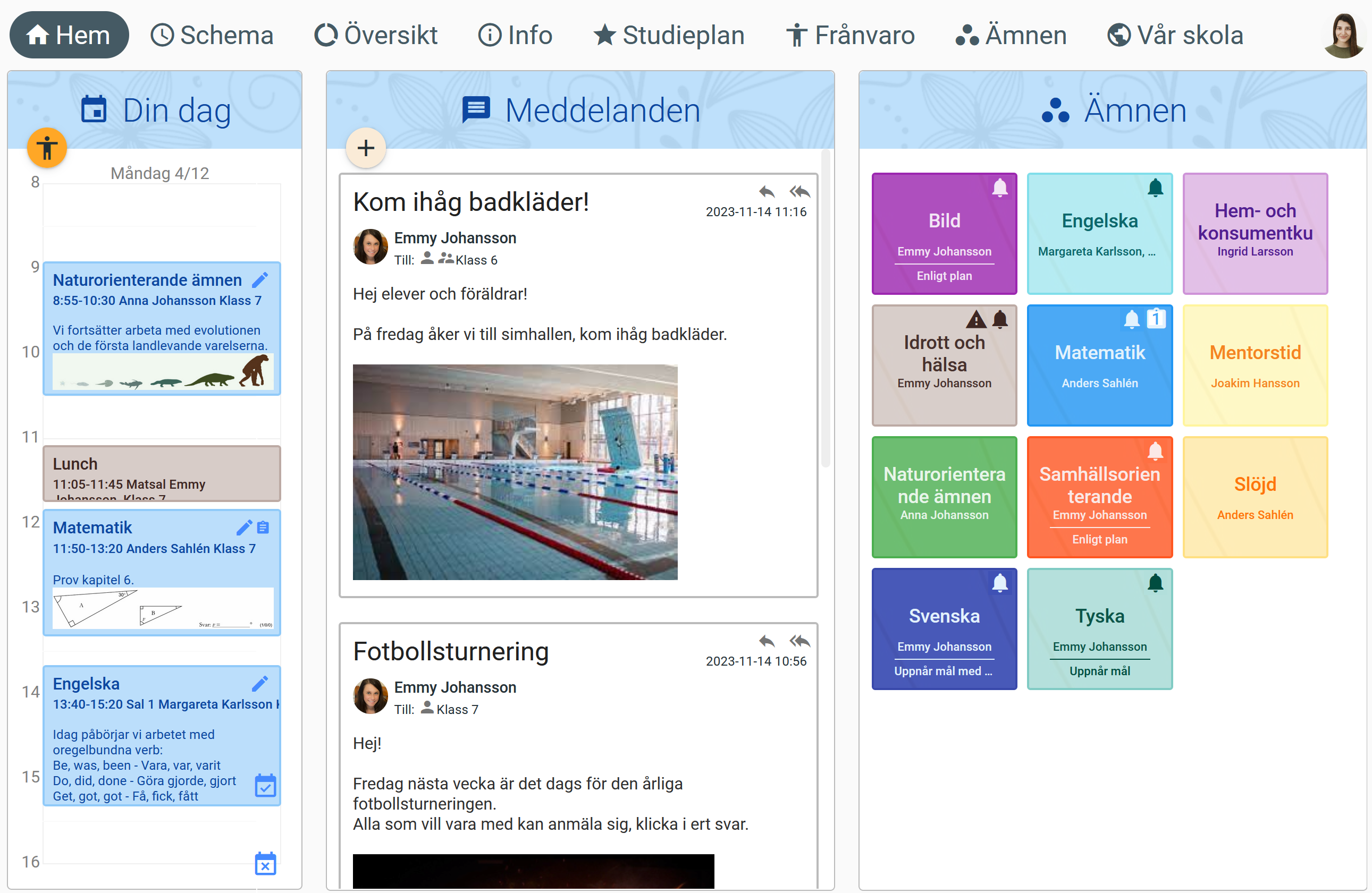 Hem-fliken öppnas och möter användaren när den loggar in. Sidan ger en överblick över aktuell information uppdelad i tre sektioner; Din dag, Meddelanden och Ämnen/Kurser.