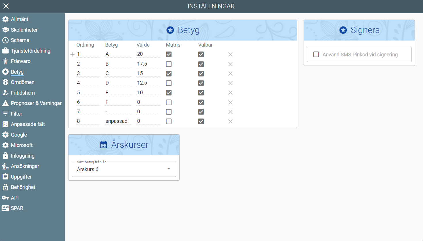 Här kan skolor mata in vilka betyg som används, från vilken årskurs betyg sätts och om det ska krävas en kod vid signering av betyg.