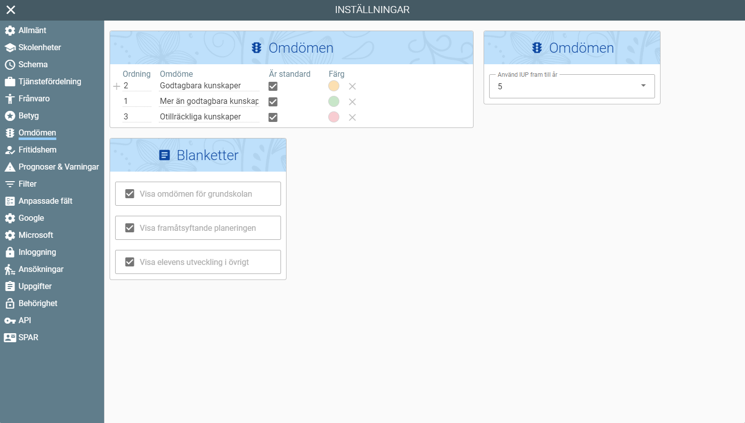 Här kan skolor mata in vilka omdömen och blanketter som ska användas.