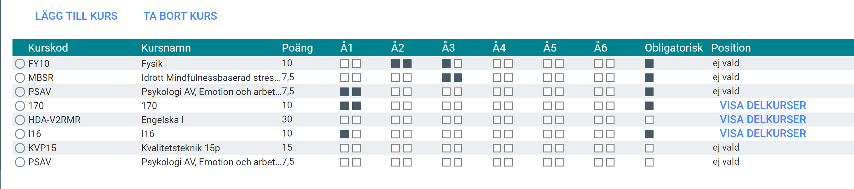 För delkurser som tidigare lagts på studieplanen kommer de att visas och fungera som tidigare men lägger man till en huvudkurs kommer delkurserna för den kursen att döljas från vanliga vyn och visas endast om man väljer att visa delkurser.