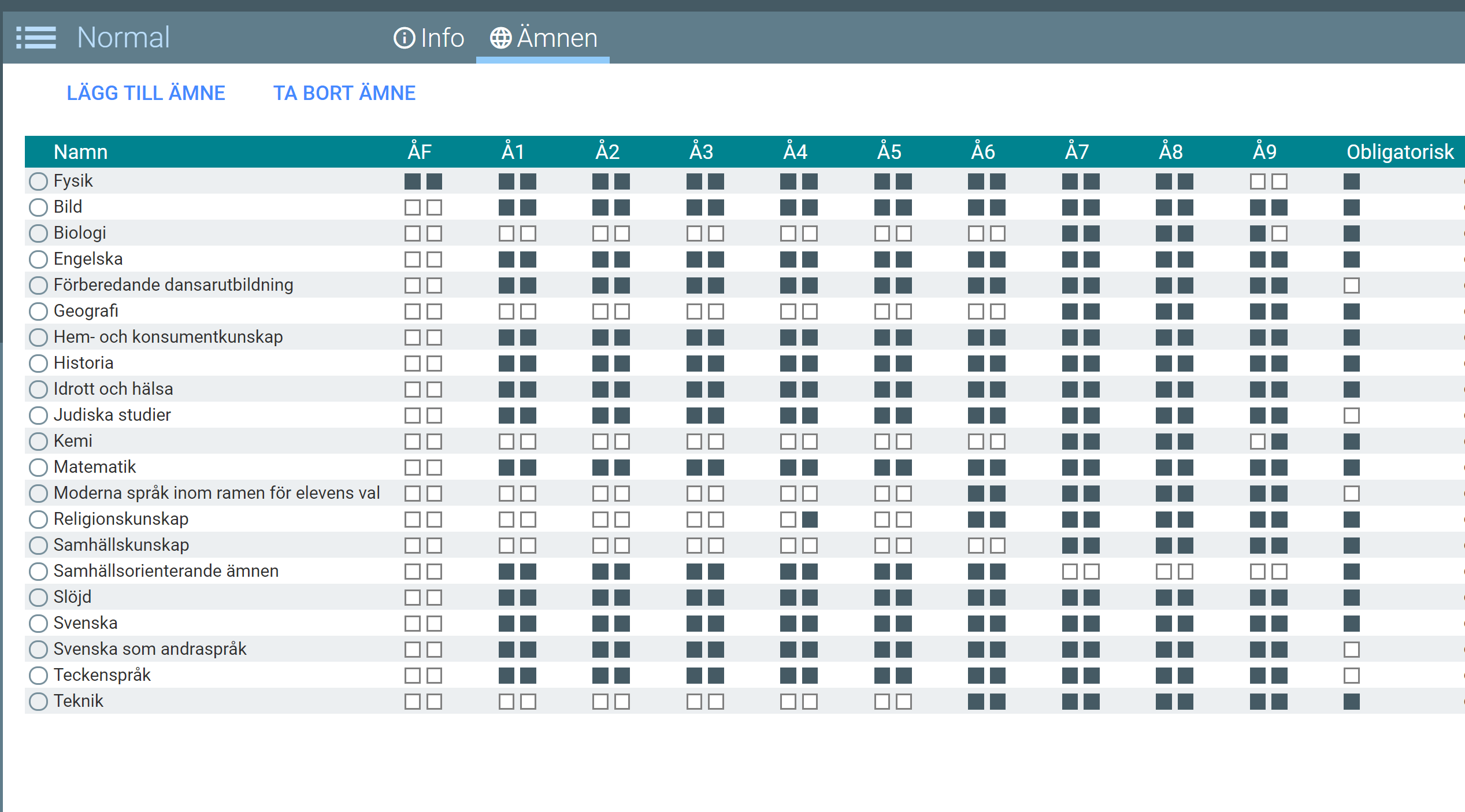 Under fliken "Ämnen" ställer man in vilka terminer som eleverna ska läsa respektive ämne och skilja på obligatoriska (hamnar automatisk på elevens individuella studieplanen) och icke-obligatoriska ämnnen.