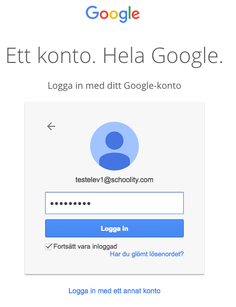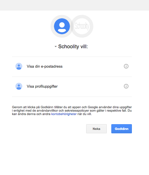 Första gången du loggar in behöver du godkänna att Schoolity får se din e-postadress och dina profiluppgifter. Klicka Godkänn för att godkänna.