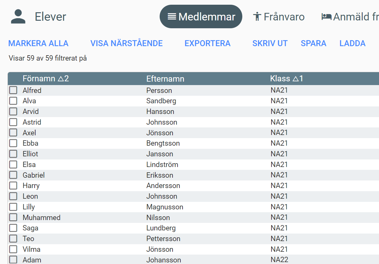 Dessa kan användas för att spara och ladda aktuell filtrering+sortering. Den här funktionen är enbart tillgänglig för personal på skolan och är till för att ha lättare åtkomst till filtreringar som skolan finner att de gör ofta.