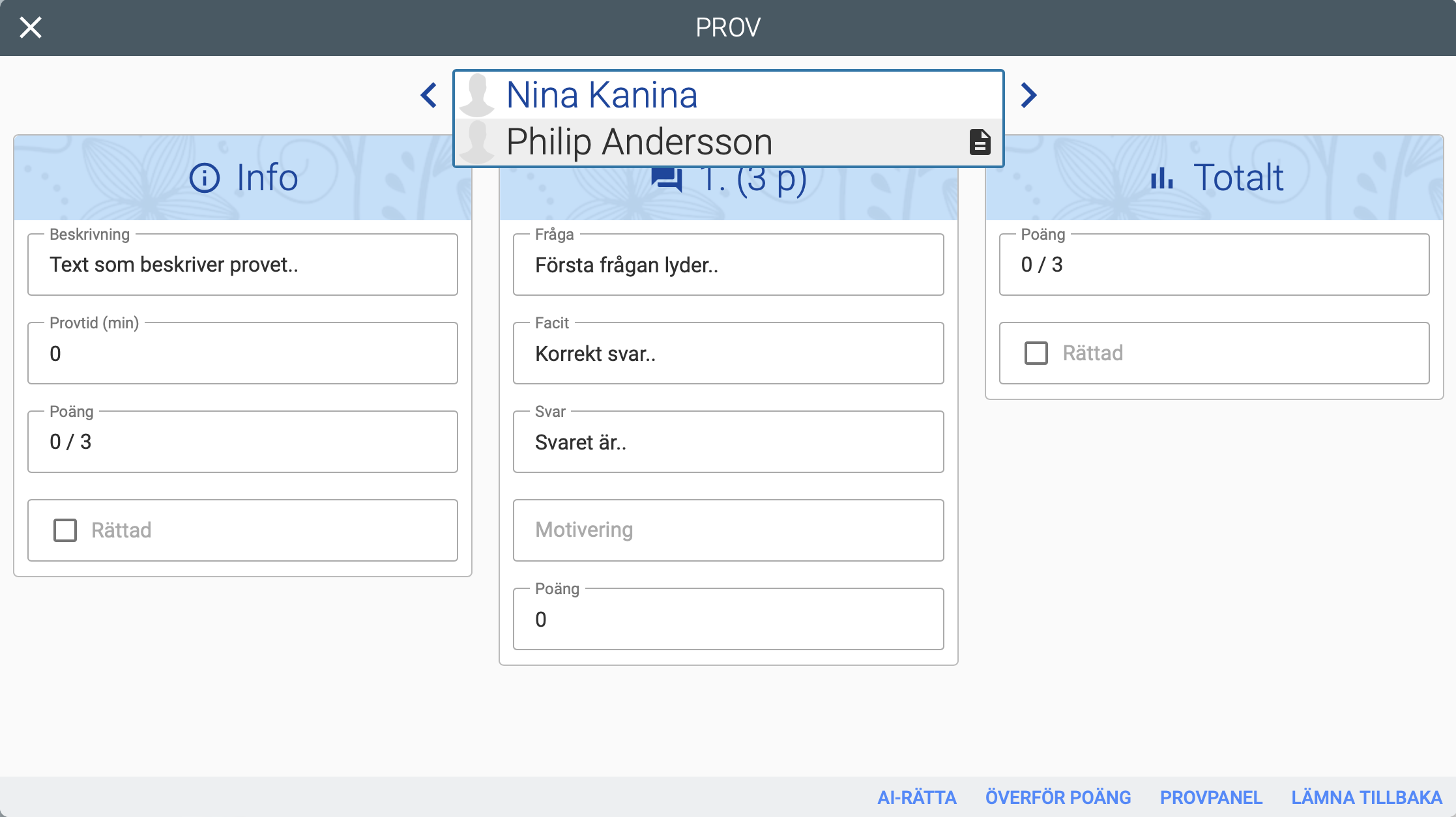 - AI-RÄTTA - Låt AI hjälpa er att rätta provet. AI jämför elevens svar med facit och delar ut en poäng från 0 till maxpoäng på frågan. Alla elever rättas på en gång.
