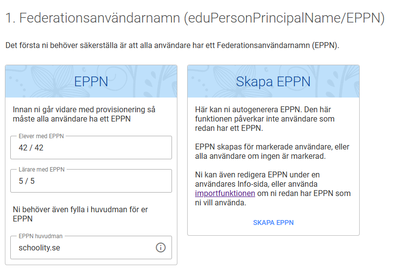 - I det här fallet så ska vårat system för EPPN hanteras precis som vanligt. Så i Schoolity så ska fältet EPPN för alla användare fyllas i med ett EPPN enligt formatet namn@huvudman.se.