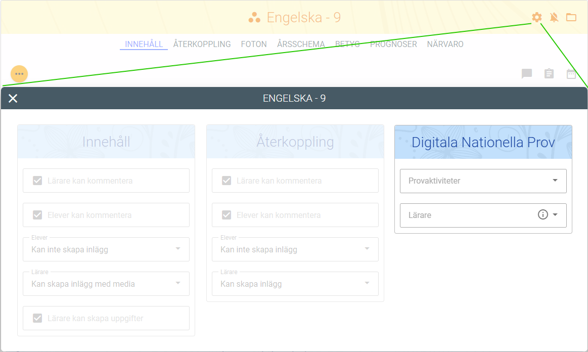 Enligt bildexemplet, klicka på kugghjulet för att ta upp inställningar och välj provaktivitet i sektionen "Digitala Nationella Prov"