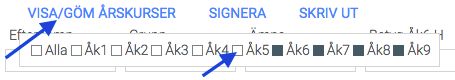 - En lista med de elever som läser detta ämne visas samt deras samtliga omdömen och betyg i ämnet. Som standard visas samtliga omdömen och betyg i ämnet för elevernas alla år i skolan. För enklare hantering finns en filtreringsfunktion som kan användas för att dölja och visa olika årskursers omdömen eller betyg. Klicka på “Visa/Göm årskurser”. Markera och avmarkera de olika årskurserna för att få önskad filtrering.