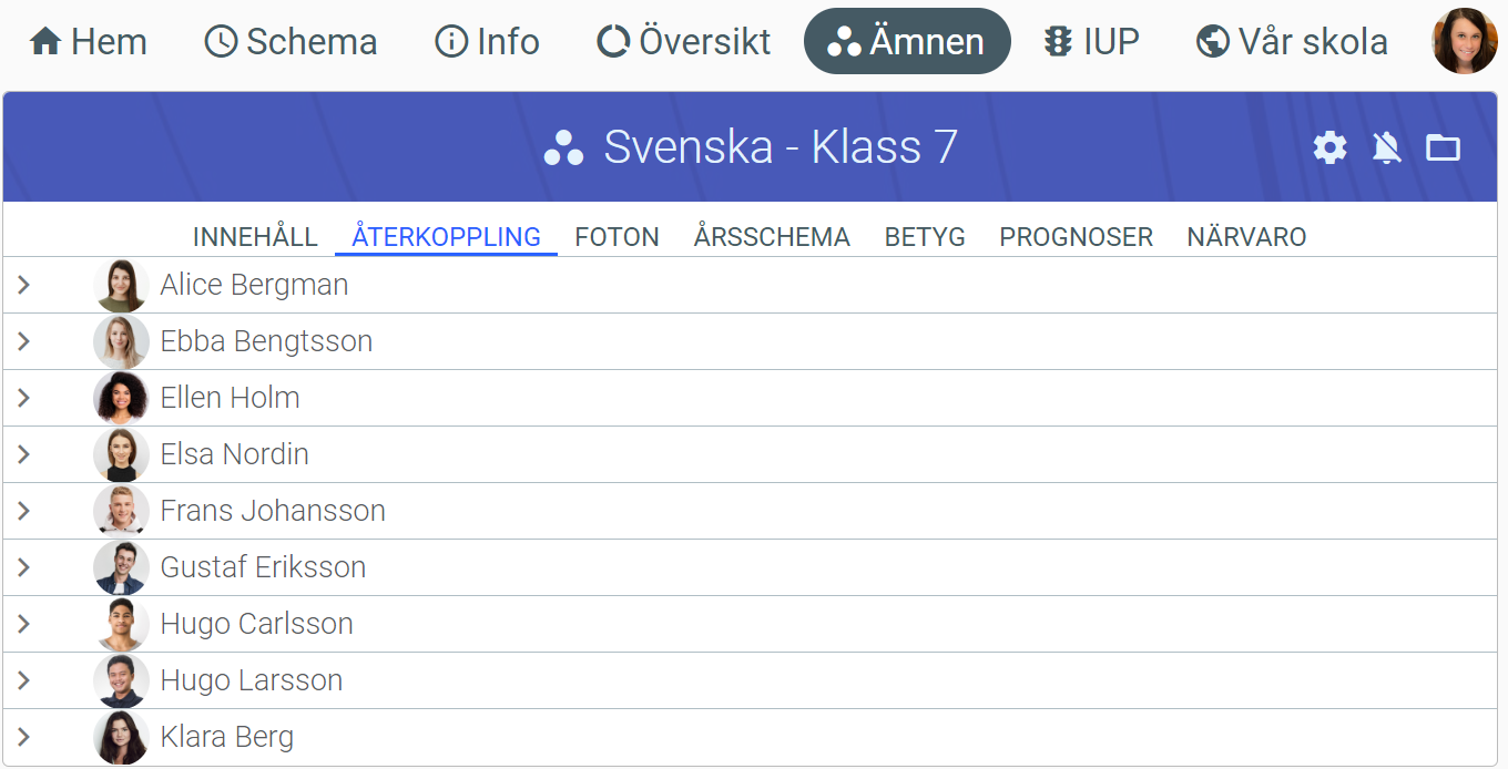 - Klicka på “Återkoppling” bland knapparna under ämnets namn och välj den elev du önskar betygsätta.