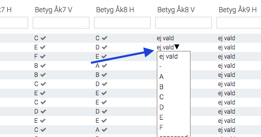 - Leta upp kolumnen för aktuellt år och termin. Välj önskat betyg i rullistan för en elev: (Betyg kan bara fyllas i för en elev i taget)
