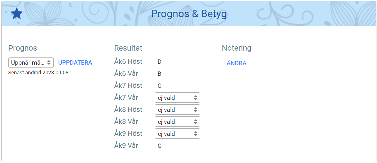 - Här visas en sammanställning av elevens all återkoppling, uppgifter, resultat och ev. ämnesmatris för detta ämne och detta läsår. Längst ned finns även betygshistorik och möjligheten att sätta prognoser, betyg och varningar. Klicka på den aktuella terminens rullista under betygskolumnen och välj önskat betyg.