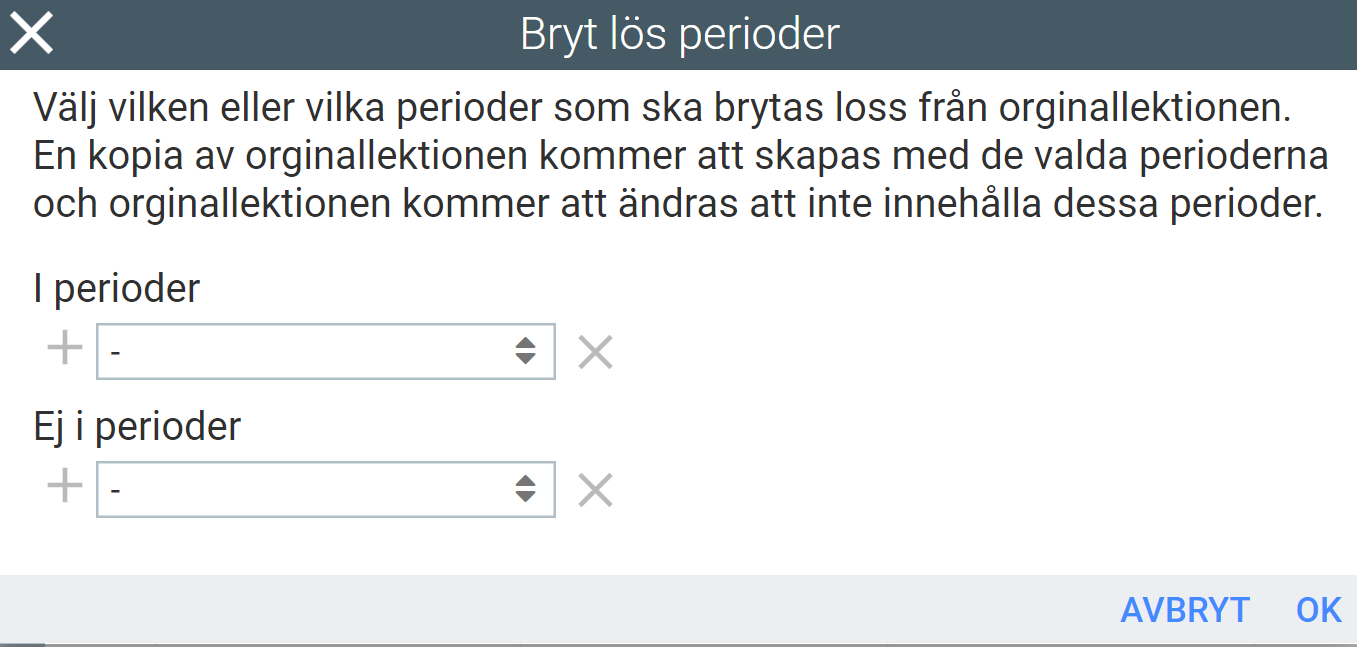 Högerklicka på en lektion, eller dra och släpp i schemat först för att markera flera lektioner, och välj sedan "Bryt lös perioder". Följande dialog öppnas: