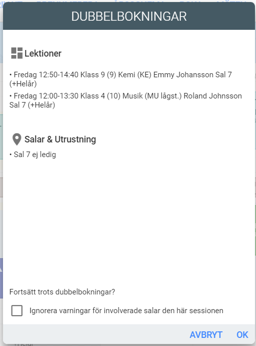 När det finns en dubbelbokning i schemat indikeras det genom en varningssymbol i hörnet av den lektionen. Om man klickar på symbolen öppnas informationsrutan som beskrivad vad dubbelbokningen gäller.