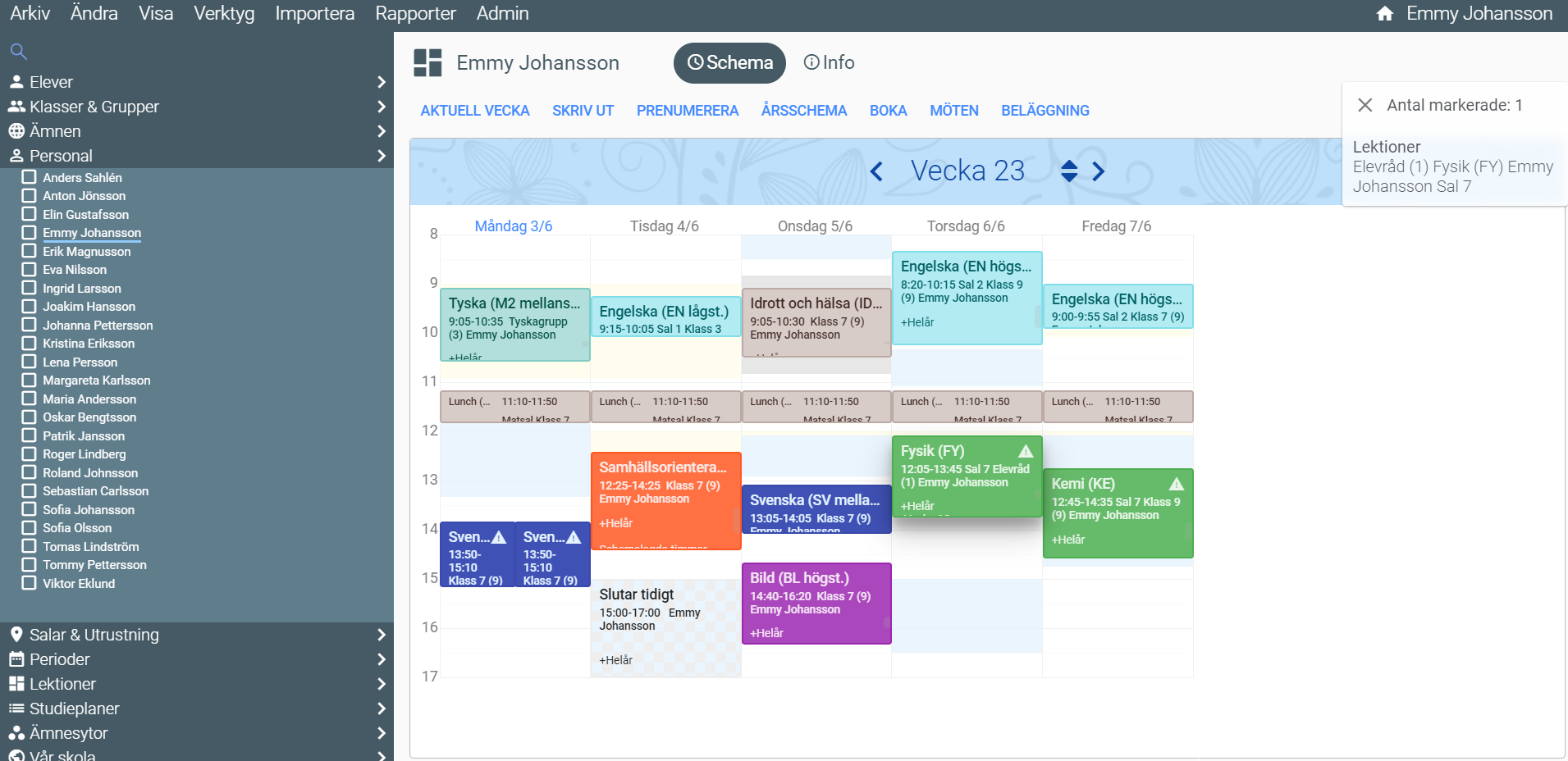 Det finns fler sätt att gruppera lektioner, nedan visas hur det görs genom att markera lektioner, vilket kan göras i navigationskolumnen eller direkt i schemat.