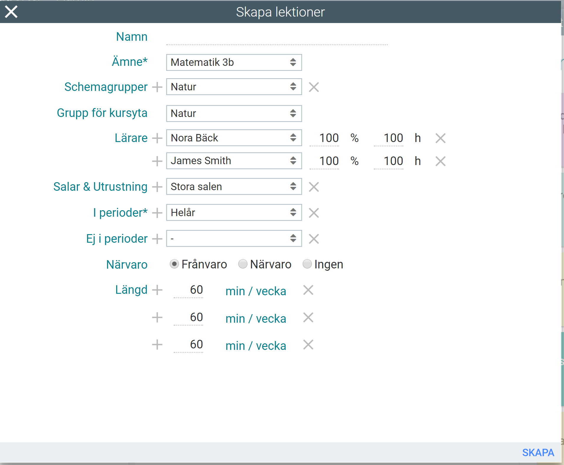 Ämnet behöver även ha schemalagda timmar för att lektionen ska synas på schemat. Det finns två sätt att skapa en lektion.