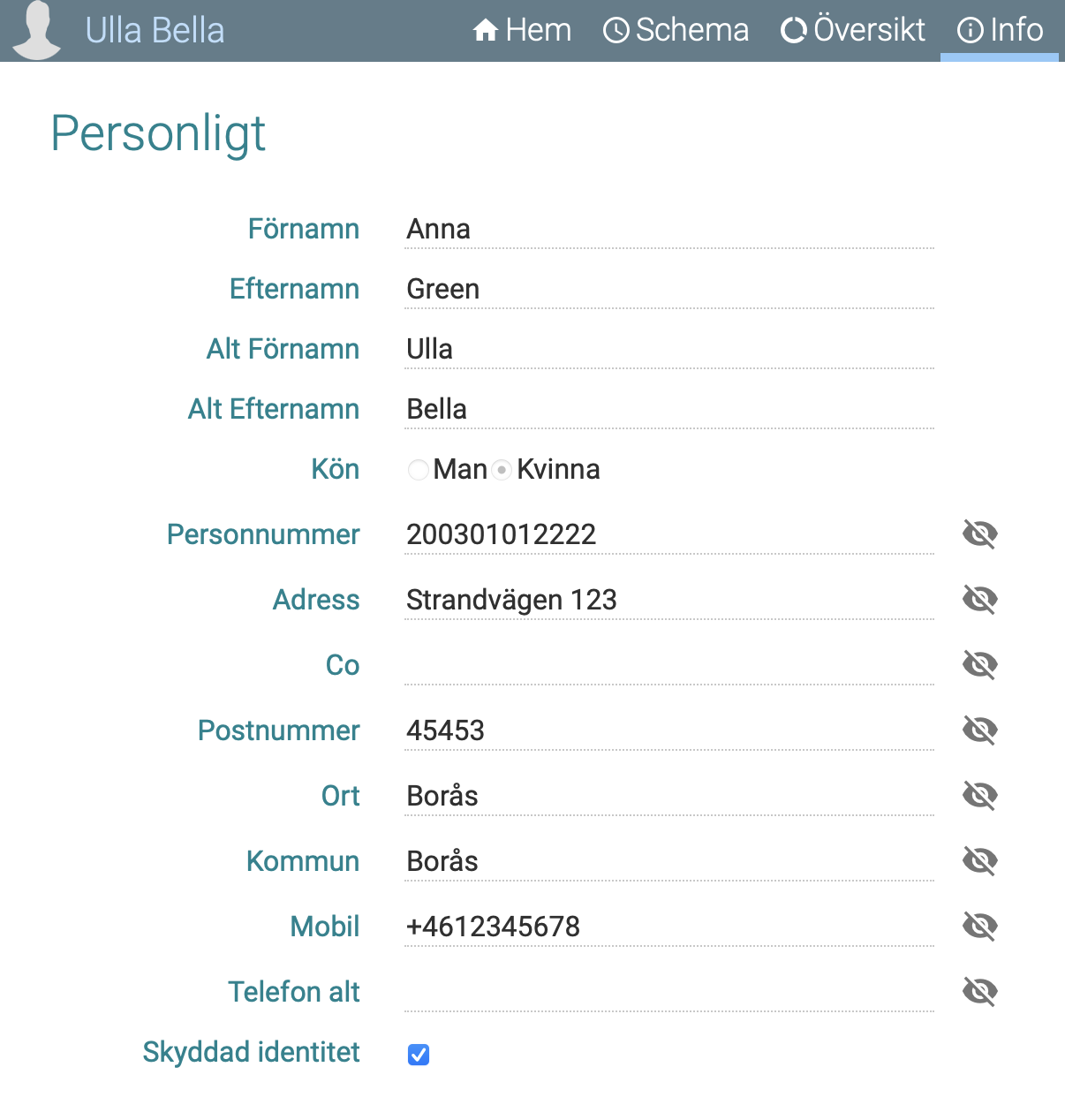 I om med att den bockas i döljs följande fält på eleven för alla användare som inte har behörigheten "Skyddad identitet".