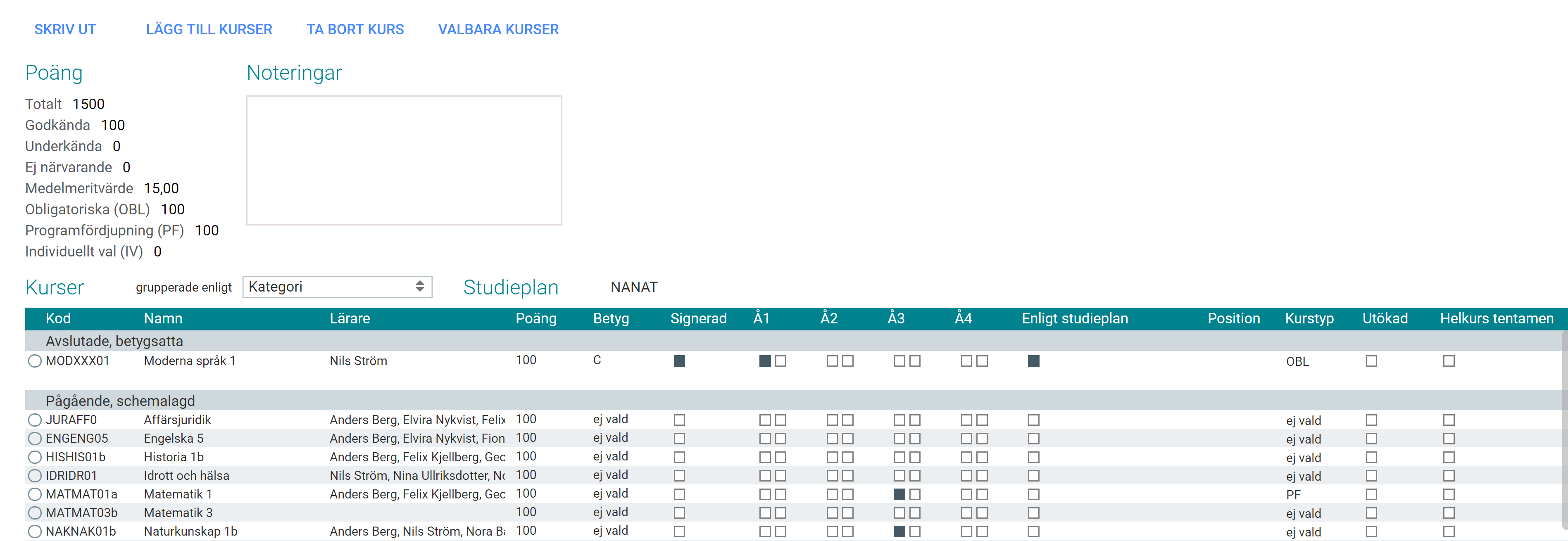 Fliken "Studieplan" visar elevens individuella studieplan. Här kan man välja valbara kurser, skriva ut studieplan och betygsdokument, sortera kurser i olika kategorier och fylla i noteringar.