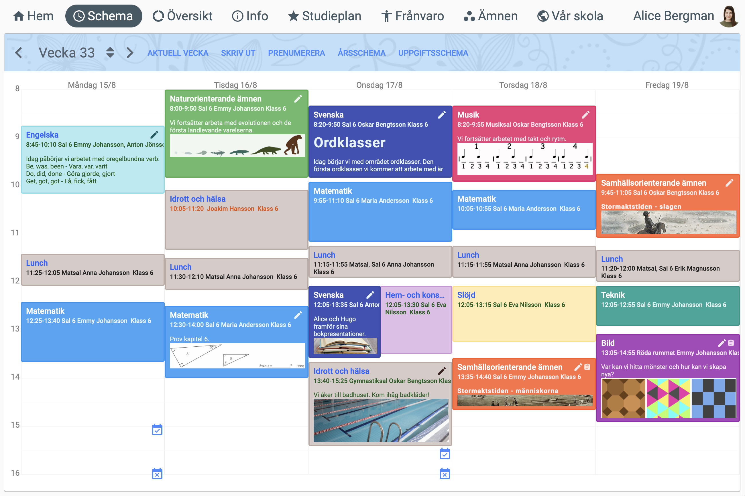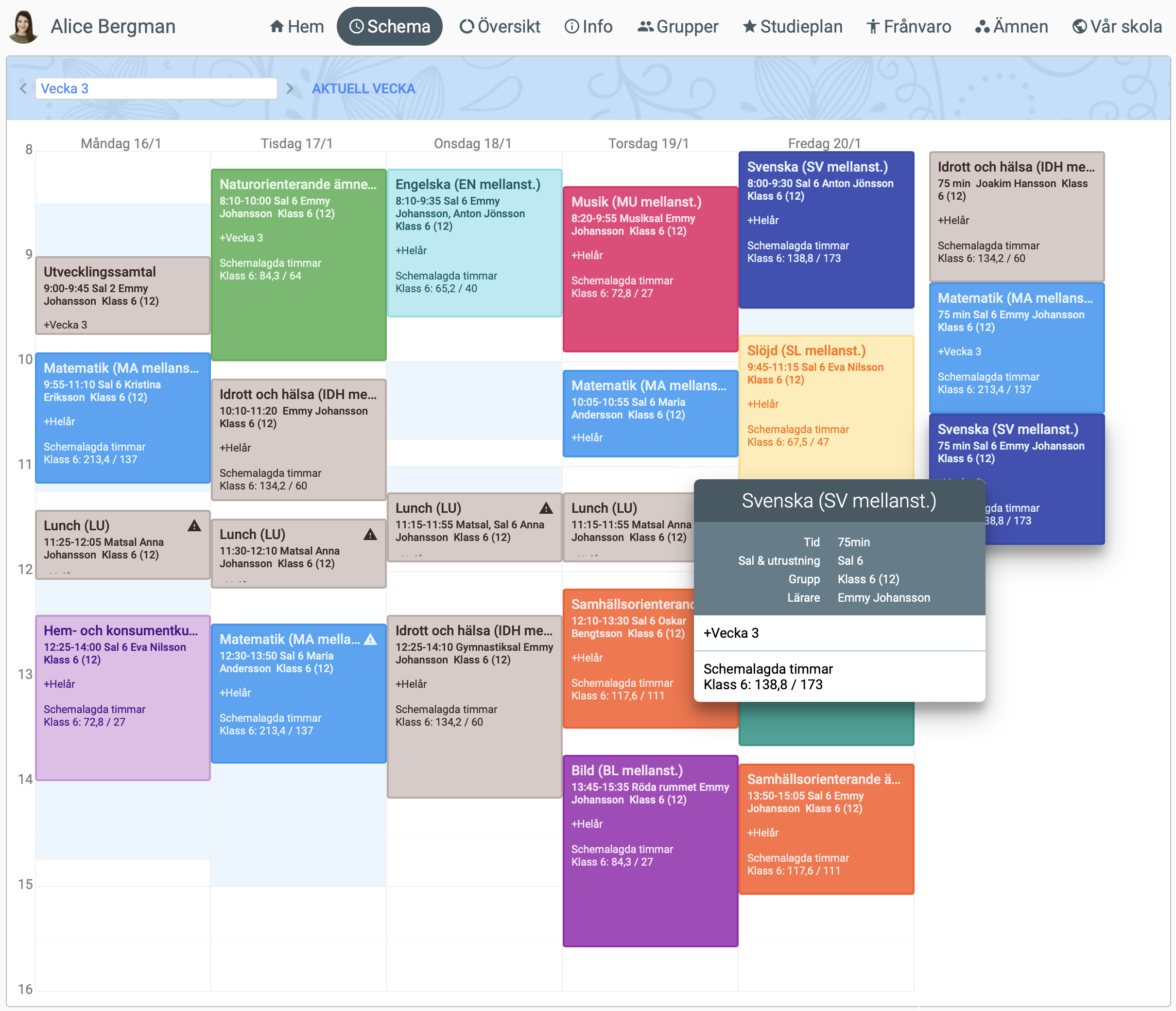 för helår, vecka eller precis vilken tidsperiod som helst. Schemat i sin tur kan visa hela veckan eller utvalda dagar. Det går även att se flera elever och grupper sida vid sida i samma schema